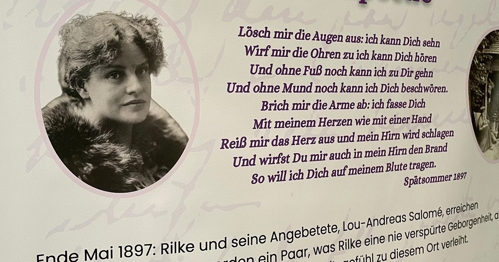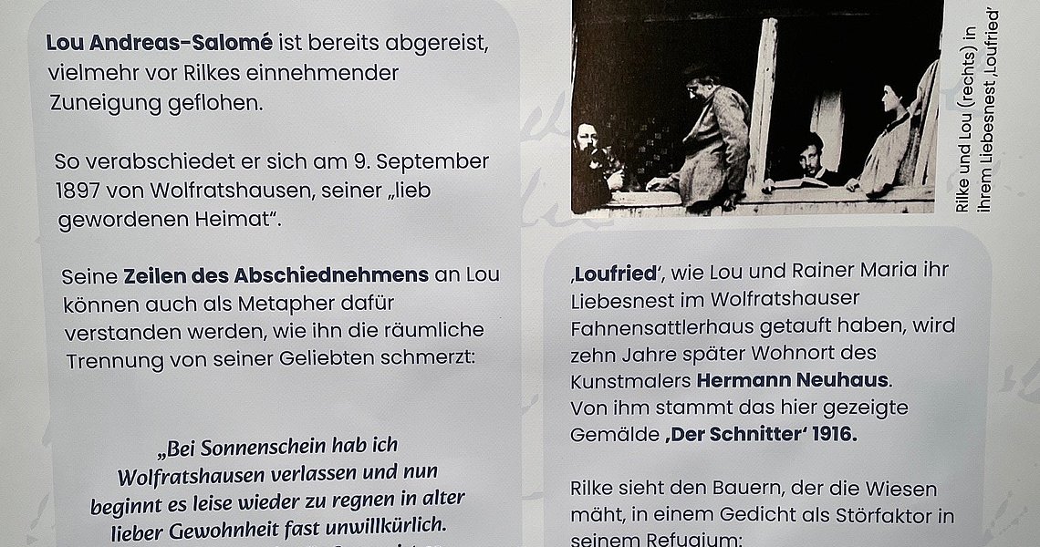 Der berühmte Dichter und Namensgeber des Ickinger Gymnasiums verbrachte im Jahr 1897 einen Sommer gemeinsam mit seiner Geliebten und Muse Lou Andreas-Salomé in Wolfratshausen. 1914 kehrte er ins Isartal zurück, diesmal nach Irschenhausen, wo er Lou Albert-Lasard begegnete. Diese beiden prägenden Beziehungen standen Pate für den Ausstellungstitel.