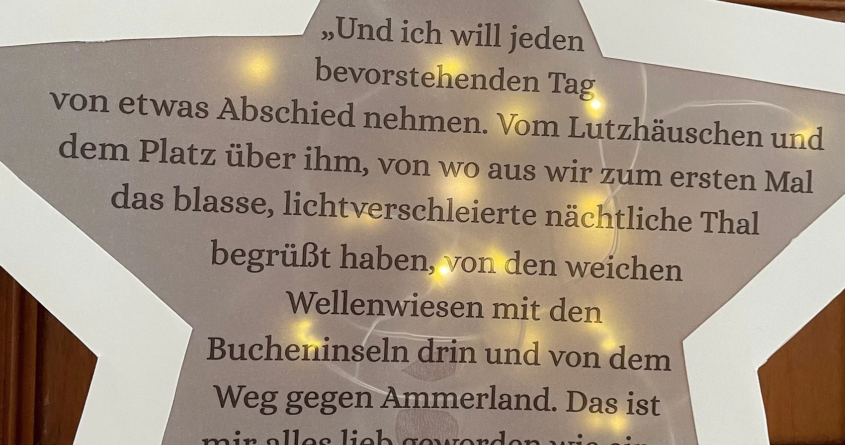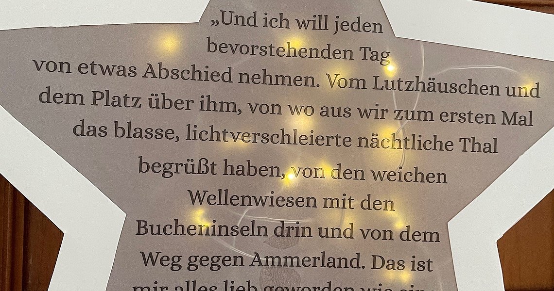 Die jungen Kuratorinnen setzen sich in ihrer Ausstellung kreativ mit Rilkes Gedichten, Briefen und Biografie auseinander. Sie beleuchten sein zentrales Lebensthema Nähe und Distanz und greifen das Symbol des Sterns auf, das in Rilkes Werk immer wieder auftaucht – vom Stern am Fensterladen des Lutzhäuschens bis zu seinen poetischen Aufzeichnungen. Hörstationen laden die Besucherinnen und Besucher ein, Rilkes Texte auch akustisch zu erleben. Zudem stellen die Schülerinnen die Frage, was einen weitgereisten Dichter wie Rilke in eine kleine Stadt wie Wolfratshausen zieht.